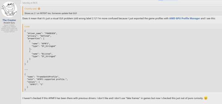 根据用户“The Creator”和“ecffg2010”的发现,在最新的AMD Radeon软件测试版本中,尽管官方发布说明和软件图形界面中均未提及AFMF 3,但通过AMD GPU配置文件管理器导出游戏配置文件后,清晰地显示了新版本的存在。社区推测,AFMF 3很可能将随AMD的25.20驱动分支正式亮相,而该分支预计将配合备受期待的FSR Redstone更新一同发布。